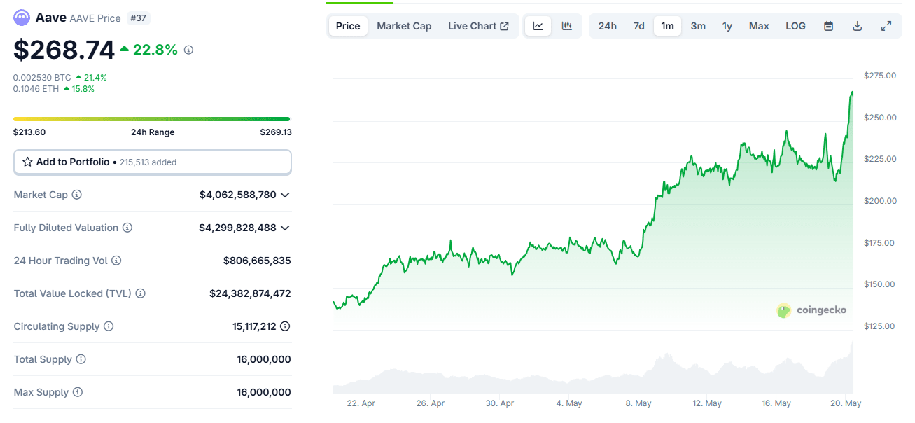 Token-ul AAVE a crescut rapid, câștigând peste 25% în doar o zi, acum tranzacționându-se la un maxim lunar de peste 268 de dolari — și aceasta ar putea fi doar începutul.