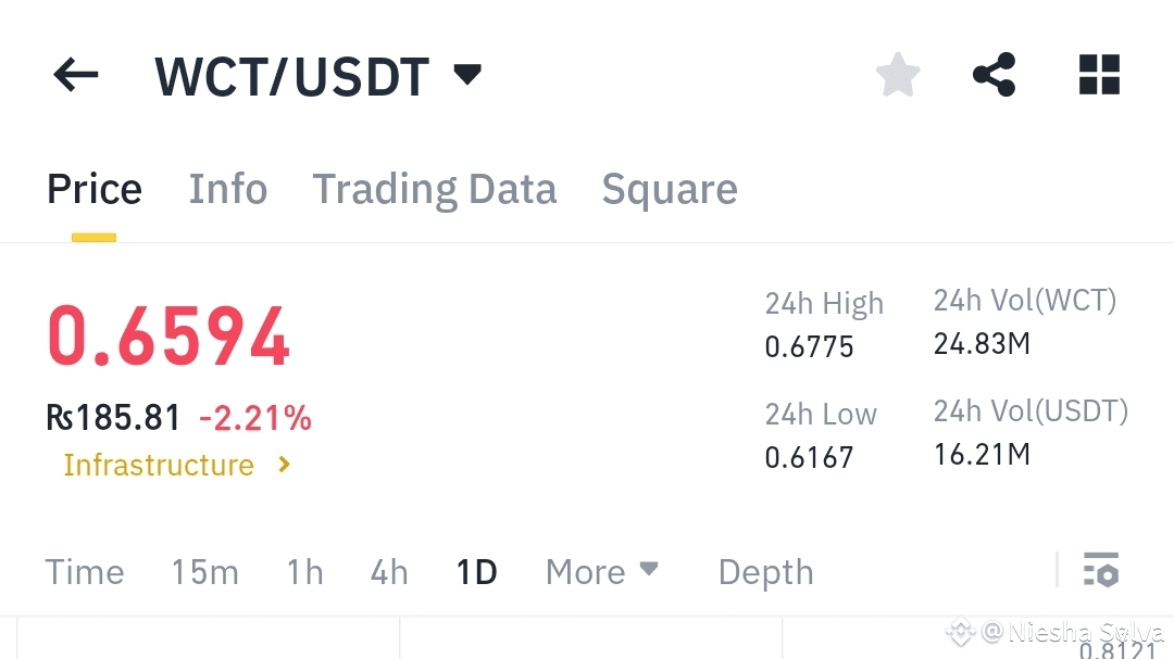 $WCT /USDT se tranzacționează în prezent la 0,6594 $, arătând o scădere de -2,21% în ultimele 24 de ore. Acțiunea recentă a pieței reflectă un război de nervi între tauri și urși, după un rally semnificativ de la 0,20 $ la un vârf de 0,7829 $ în ultimele luni — o creștere de 290%.