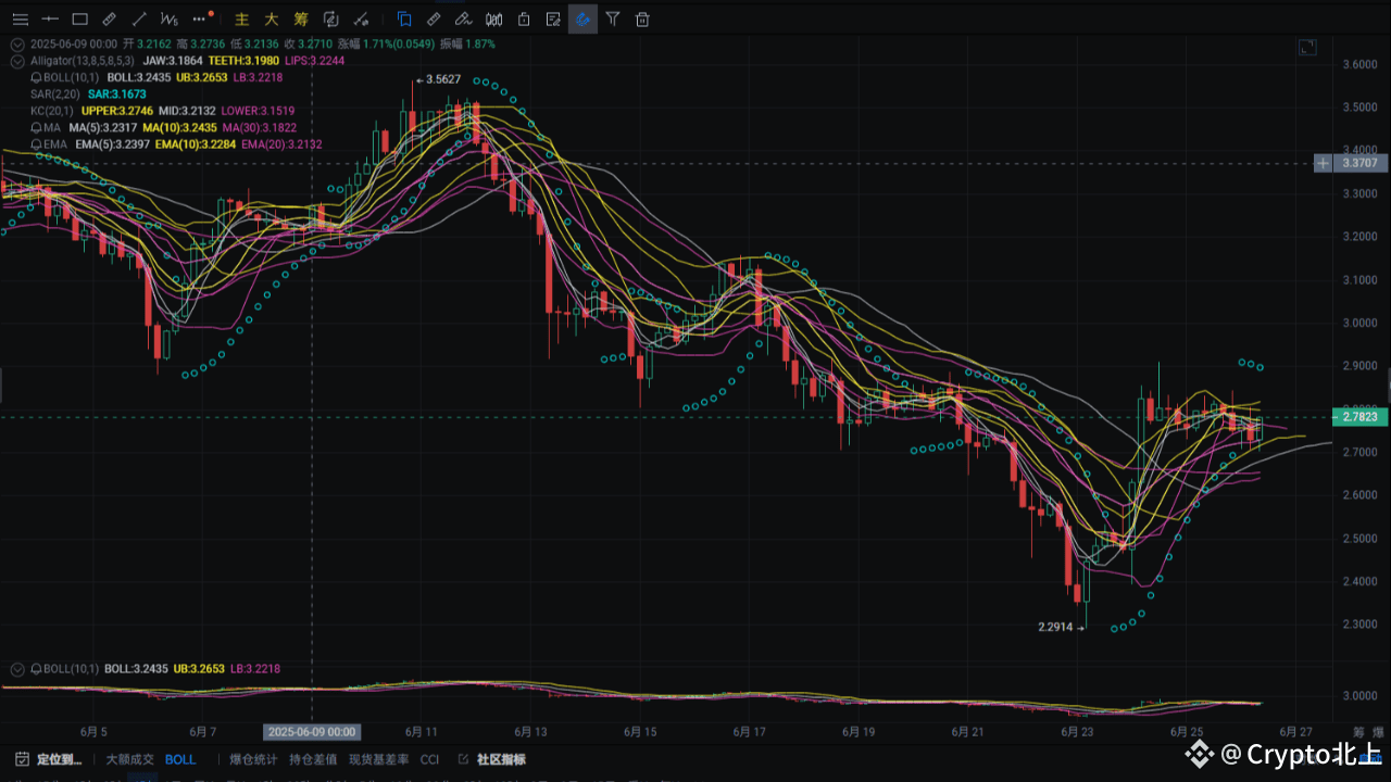 Observație structurală: Din perspectiva graficului de 4H, SUI a crescut lent de la 2.29, stabilizându-se pe mai multe medii mobile pe termen scurt. Totuși, presiunea evidentă de 3.00 limitează în mod clar, iar poziția mediei mobile Bollinger formează o constrângere continuă asupra prețului.