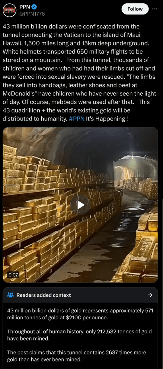 O afirmație sălbatică care circulă online spune că $43 milioane de miliarde (da, milioane de miliarde) în aur a fost confiscat dintr-un tunel subteran misterios între Vatican și Maui, Hawaii. Postarea susține că tunelul avea 1.500 de mile lungime și 15 km adâncime, și era plin de aur și folosit într-o operațiune globală de trafic de copii.