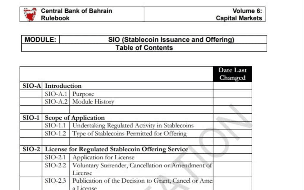 Sub Modul SIO, orice entitate care dorește să emită, să ofere sau să faciliteze tranzacții în stablecoins trebuie să treacă printr-un proces de licențiere cu Banca Centrală din Bahrain.