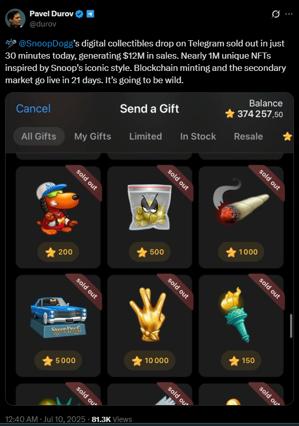 Legenda rap-ului Snoop Dogg a zguduit din nou lumea crypto. Cea mai recentă colecție NFT a sa pe Telegram Gifts s-a vândut în doar 30 de minute, generând un venit impresionant de 12 milioane de dolari, conform CEO-ului Telegram, Pavel Durov.