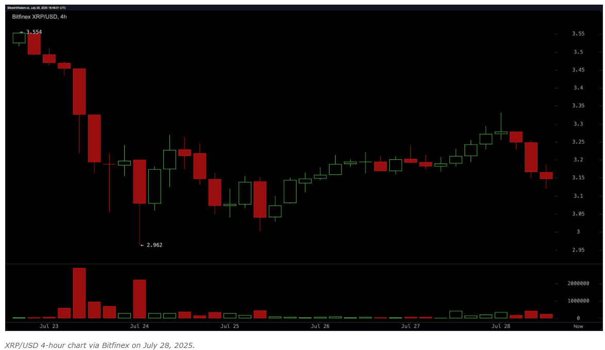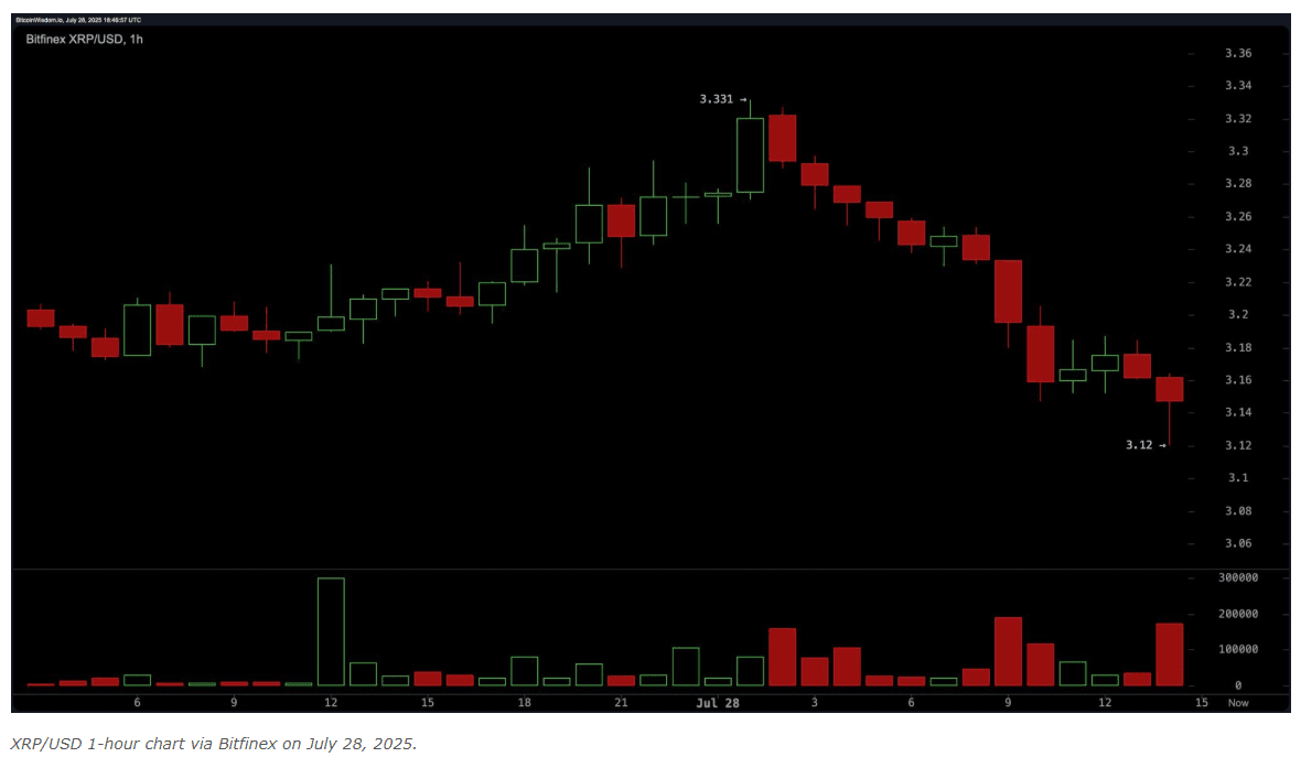 XRP \u003cc-53/\u003e se tranzacționează la 3,14 USD la 3,16 USD în ultimele 60 de minute, cu o capitalizare de piață de aproximativ 187 miliarde USD și un volum de tranzacționare de 24 de ore de 7,47 miliarde USD. Prețul intraday a fluctuat între 3,12 USD și 3,32 USD, indicând o gamă de tranzacționare restrânsă în mijlocul semnalelor tehnice mai largi.