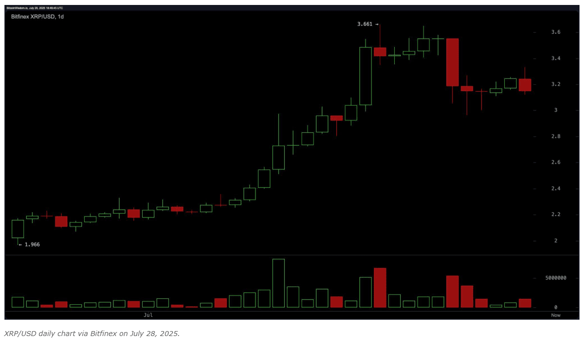 Graficul zilnic arată o tendință ascendentă mai largă extinsă de la aproximativ 2,00 USD până la un maxim recent de 3,661 USD, deși aceasta a fost urmată de o corecție bruscă. Volumul crescut la vârf ar putea indica o fază de distribuție, în timp ce apariția unui model bearish engulfing și lumânările roșii ulterioare sugerează o presiune de vânzare continuă. În prezent, XRP se consolidează în intervalul de 3,15–3,30 USD, plutesc deasupra suportului cheie la 3,00–3,10 USD. Nivelurile de rezistență sunt situate la 3,50 USD și 3,66 USD. Confirmarea bullish printr-o rupere deasupra 3,35 USD, însoțită de un volum puternic, este esențială pentru orice perspectivă optimistă. O eșec în a menține 3,00 USD ar putea conduce la un scenariu de rupere.