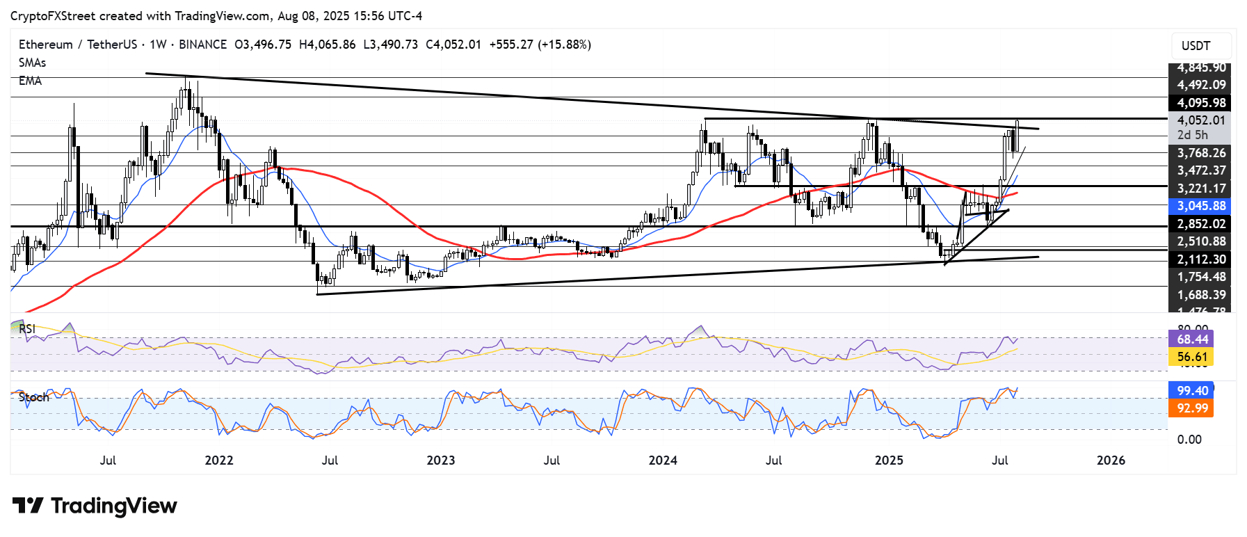 Graficul FXStreet arată un steag optimist; o rupere deasupra $4,100 ar putea propulsa ETH spre $4,500, cu maximele istorice (~$4,868) în vizor.