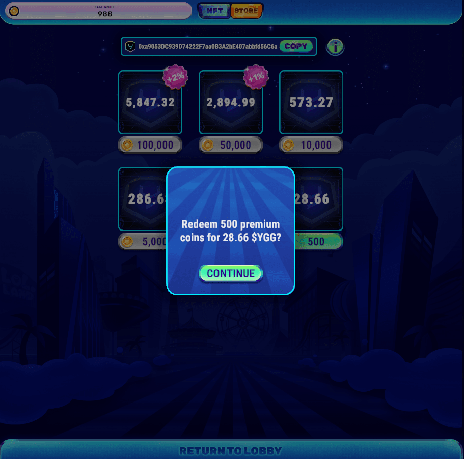 Interfața pentru schimbul de puncte: în funcție de punctele obținute pe tabloul dvs., schimbați YGG și retrageți în portofel