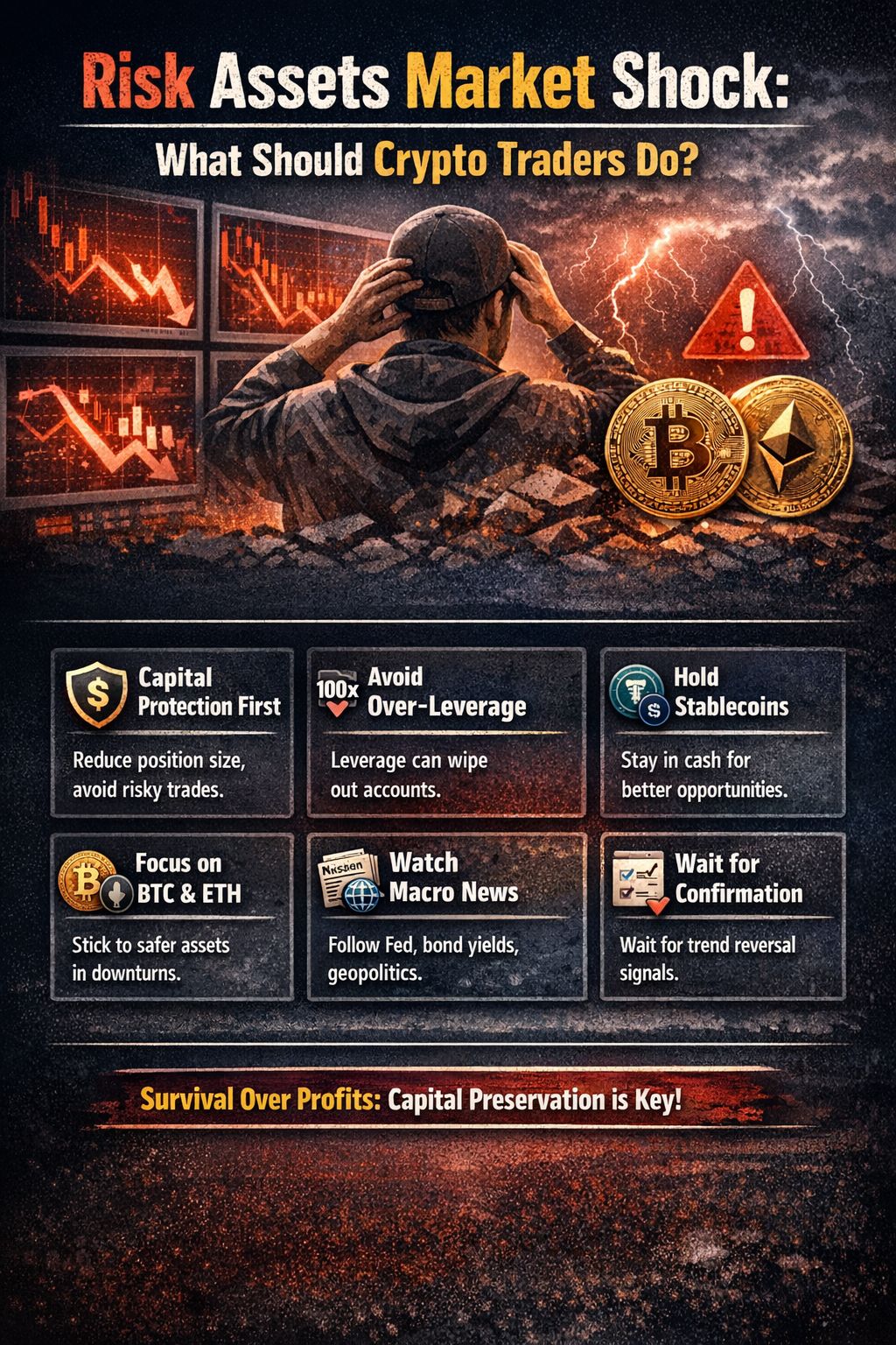 For crypto traders, the first priority should be capital protection. Instead of chasing profits, traders should reduce position sizes and avoid emotional decisions. Over-leveraging in futures trading is especially dangerous during market shocks, as sudden price swings can easily wipe out accounts.