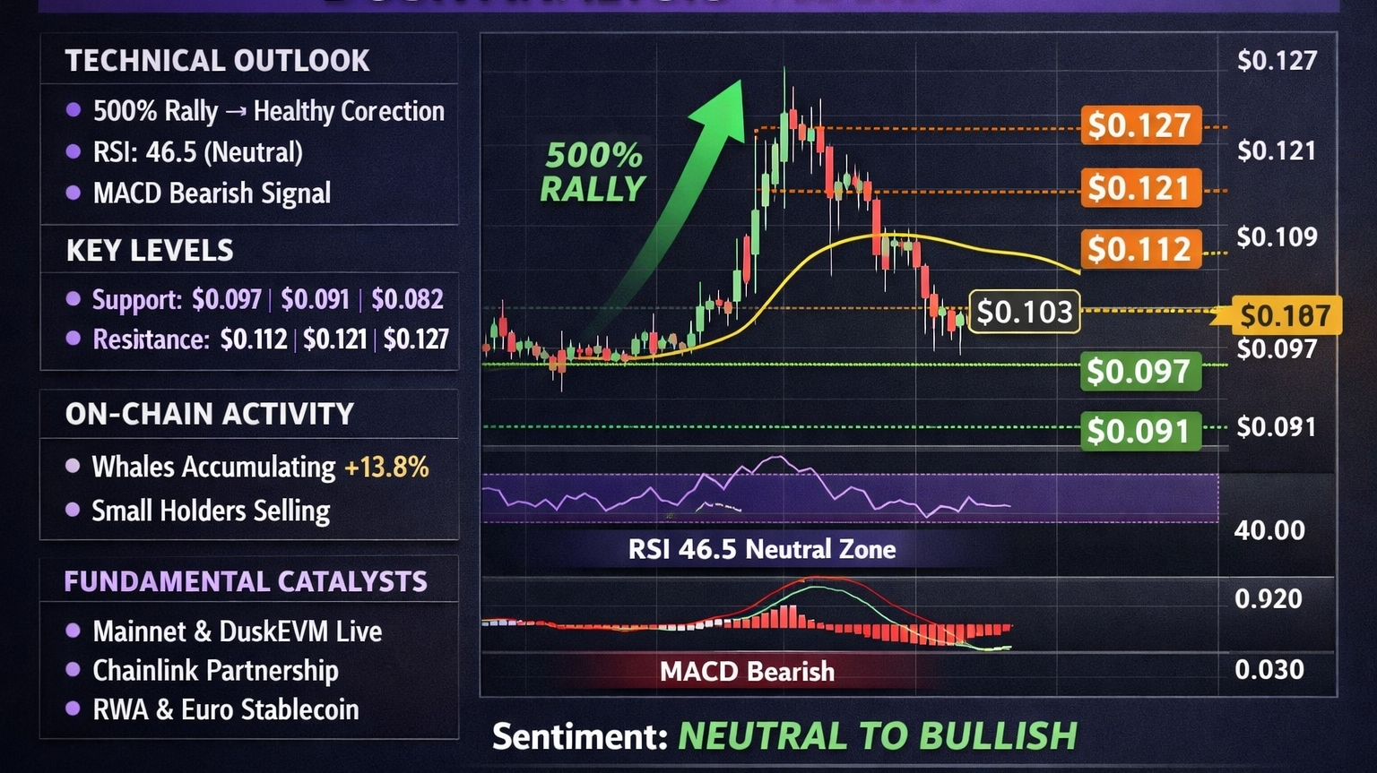 DUSK se consolidează în prezent în jurul $0.10 după o creștere masivă de 500%. Piața este într-o fază sănătoasă de corecție cu RSI aproape neutru și suport cheie la $0.095. Acumularea de balene în timpul scăderii semnalează o încredere puternică pe termen lung.