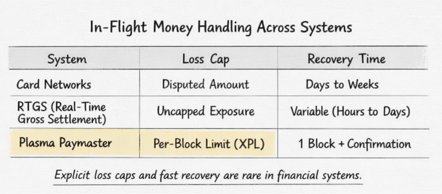 What interested me is that Plasma doesn’t answer this rhetorically. It answers it structurally. The loss cap is bounded by per-block sponsorship limits enforced at the contract level. If the paymaster is drained, the maximum loss equals the allowance for that block—no rolling exposure, no silent accumulation. Recovery isn’t social or discretionary; it’s deterministic. Within the next block, the system can halt sponsorship and revert to user-paid fees, preserving liveness without pretending nothing happened.