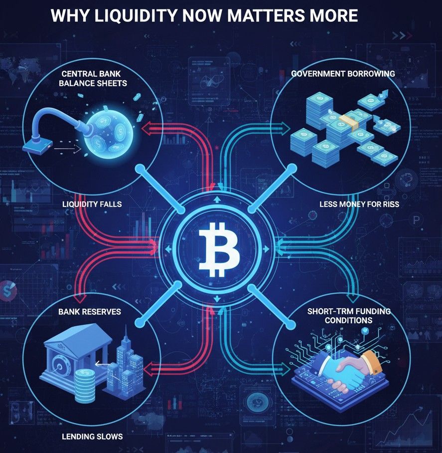 So instead of reacting mainly to interest rate news, Bitcoin is now responding more to how much money is actually available to invest.