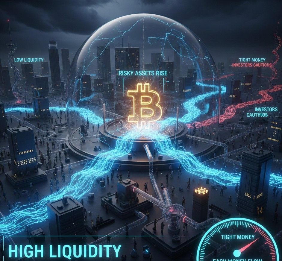 This means Bitcoin often rises when money flows freely and struggles when cash becomes tight.