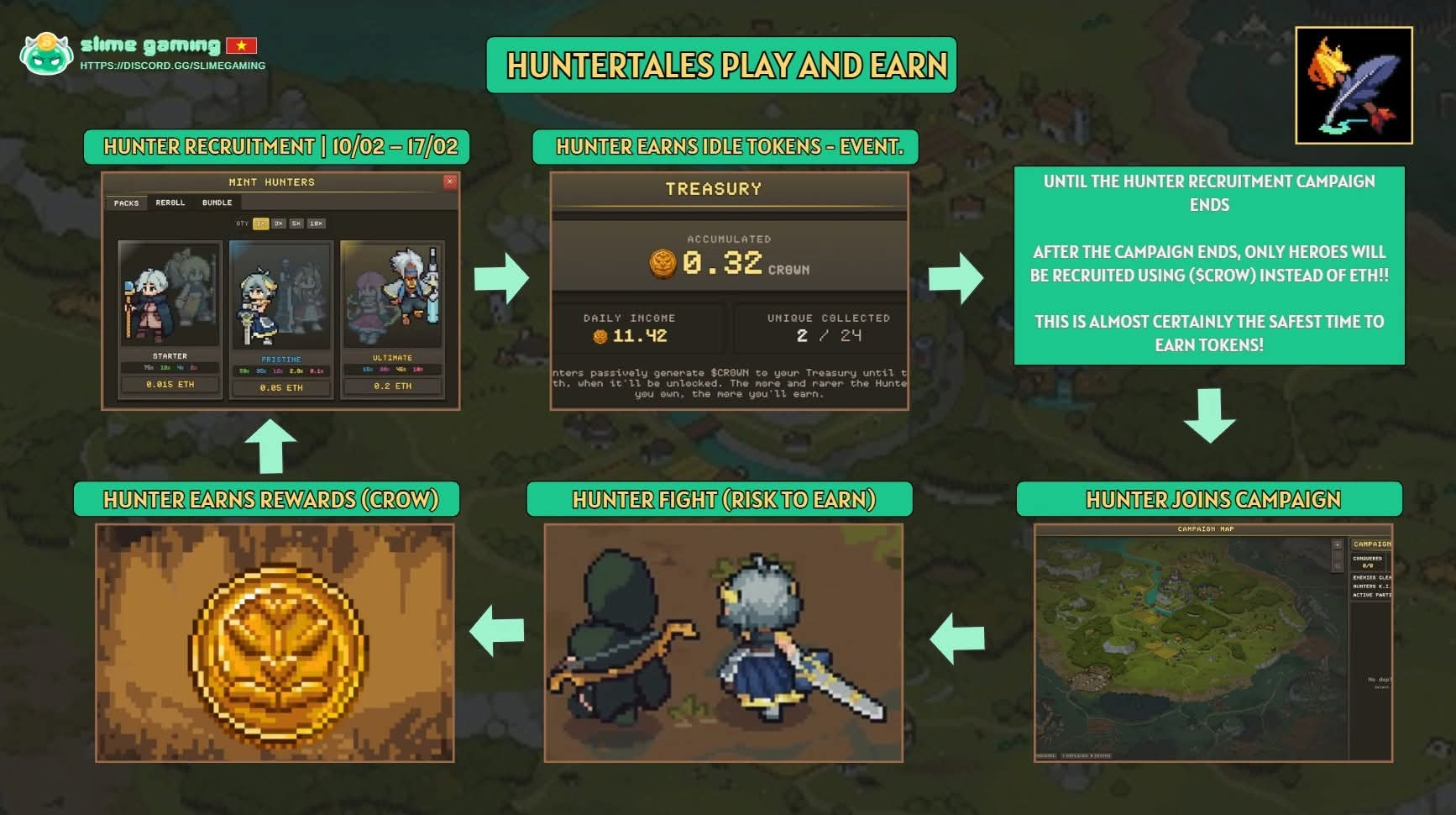 - Trong thời gian sự kiện, mỗi Hunter sẽ tạo $CROWN thụ động và tích lũy vào Treasury, gần như không có rủi ro tử vong.