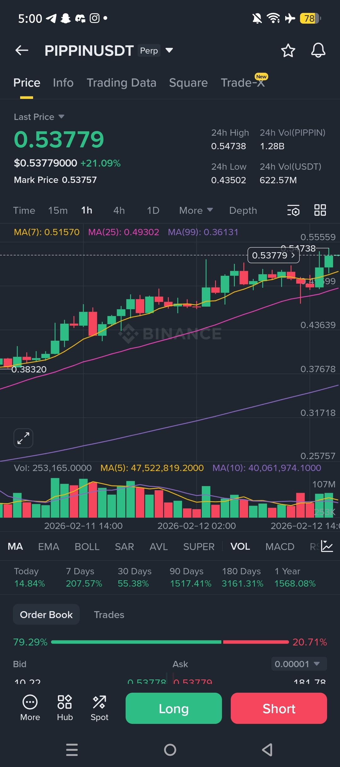 PIPPIN has shown notable bullish momentum on shorter timeframes, with multiple consecutive green candles driving a strong rebound that pushed price through resistance and above key moving averages, signaling a shift in market bias toward buyers. On the 4‑hour chart, a series of six green candlesticks in a row reflected sustained buying pressure and short‑term bullish momentum, often seen after heavy accumulation or short squeezes