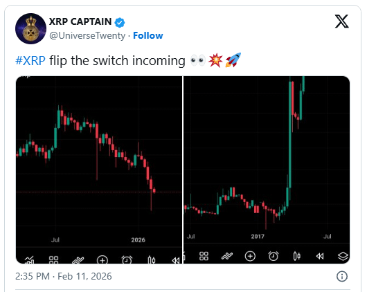 Teza Căpitanului XRP își trage puterea din precedentul istoric. Ciclurile anterioare de piață au demonstrat că XRP poate rămâne liniștit pentru perioade lungi înainte de a accelera rapid odată ce lichiditatea și sentimentul se aliniază. Raliul exploziv din timpul ciclului din 2017 rămâne cel mai clar exemplu de cât de repede momentul poate transforma consolidarea în expansiune.
