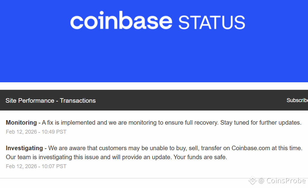 The disruption was first acknowledged by the company on February 12, 2026. In an official update on its status page and X (formerly Twitter) account, Coinbase Support stated: “We are aware that customers may be unable to buy, sell, transfer on https://www.coinbase.com/ at this time. Our team is investigating this issue and will provide an update. Your funds are safe.”