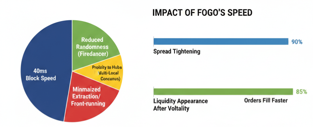 I keep watching Fogo during live volatility and asking myself if this speed is just a number or something deeper. Forty millisecond blocks sound impressive but what matters is how traders react when markets move fast. I notice spreads tighten quicker. Orders fill with less hesitation. It feels like risk is being priced differently because final settlement arrives almost instantly. When time shrinks uncertainty shrinks and that changes behavior.