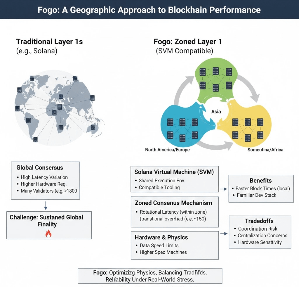 Fogo is built on the Solana Virtual Machine, which means it uses the same smart contract execution environment as Solana. That makes it compatible with existing Solana tools and applications. But compatibility alone does not explain why it exists. Fogo’s core idea is that blockchain speed is not only a software issue. It is a geography and hardware issue. Data moves at limited speed across the globe. Validators are physical machines. Physics applies whether we like it or not.