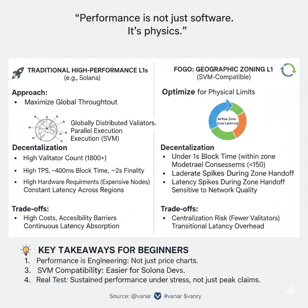 How much performance is worth sacrificing accessibility and decentralization? Every Layer 1 answers that differently. Solana prioritizes scale with heavy hardware. Aptos and Sui balance controlled validator sets with BFT pipelines. Fogo adds geographic zoning to that spectrum.