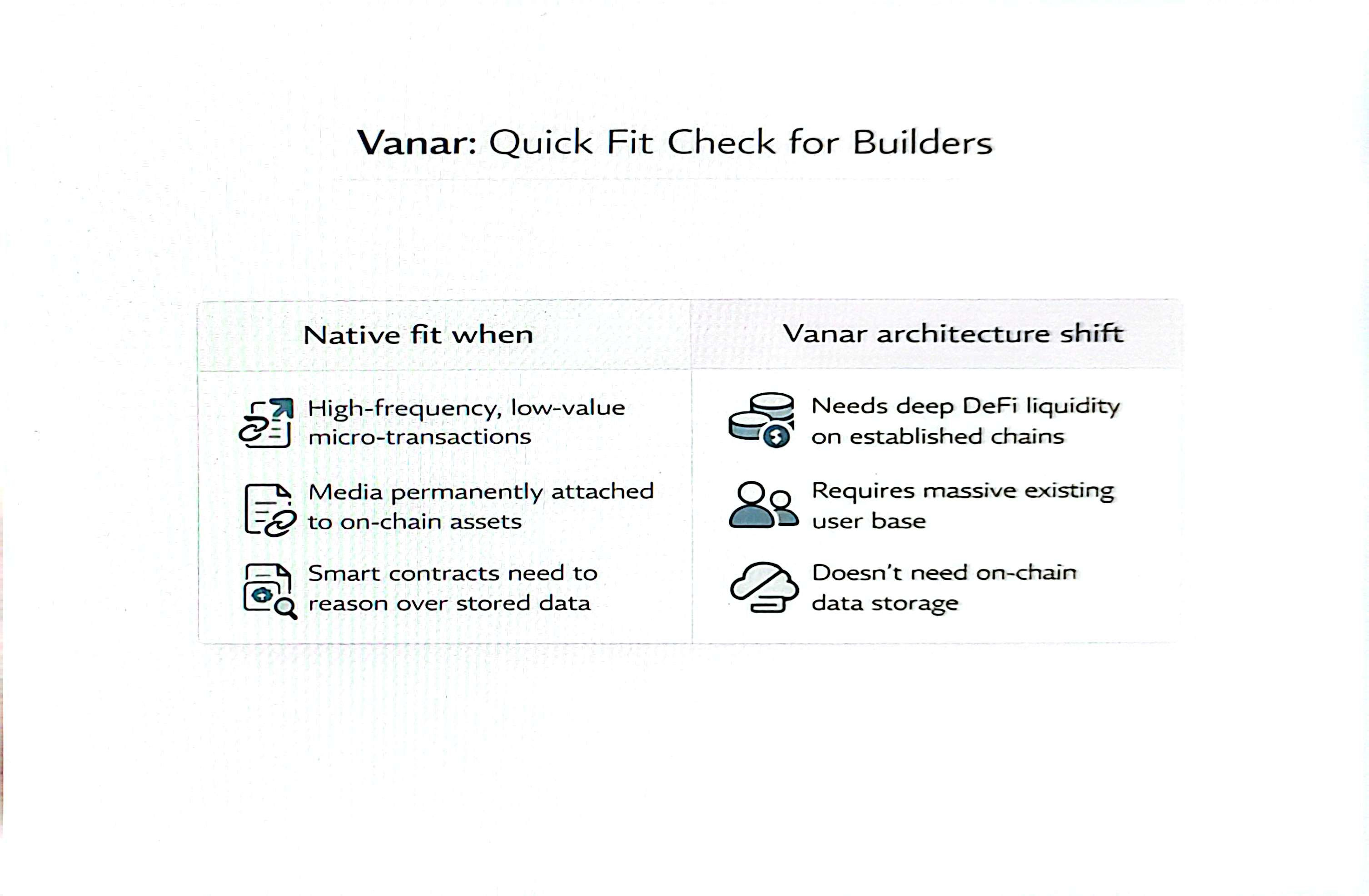 Native fit when: your app produces high-frequency, value low transactions; requires media inextricably attached to on-chain assets; or can make use of smart contracts reasoning about data in stores.