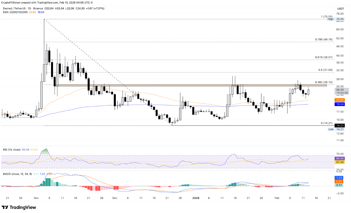 Decred (DCR) a înregistrat o recuperare de peste 7% la momentul redactării acestui articol vineri, după o serie de trei sesiuni de corecție consecutive care au dus la o pierdere de aproape 14%. Această creștere a fost susținută considerabil de volumul de tranzacționare, care a crescut cu aproximativ 60% în ultimele 24 de ore, reflectând clar îmbunătățirea cererii pe piața spot. Totuși, din punct de vedere tehnic, Decred se confruntă în continuare cu o mare presiune din partea zonei de rezistență în jurul nivelului de 26 USD — o zonă care a limitat adesea avansul încă din luna noiembrie.