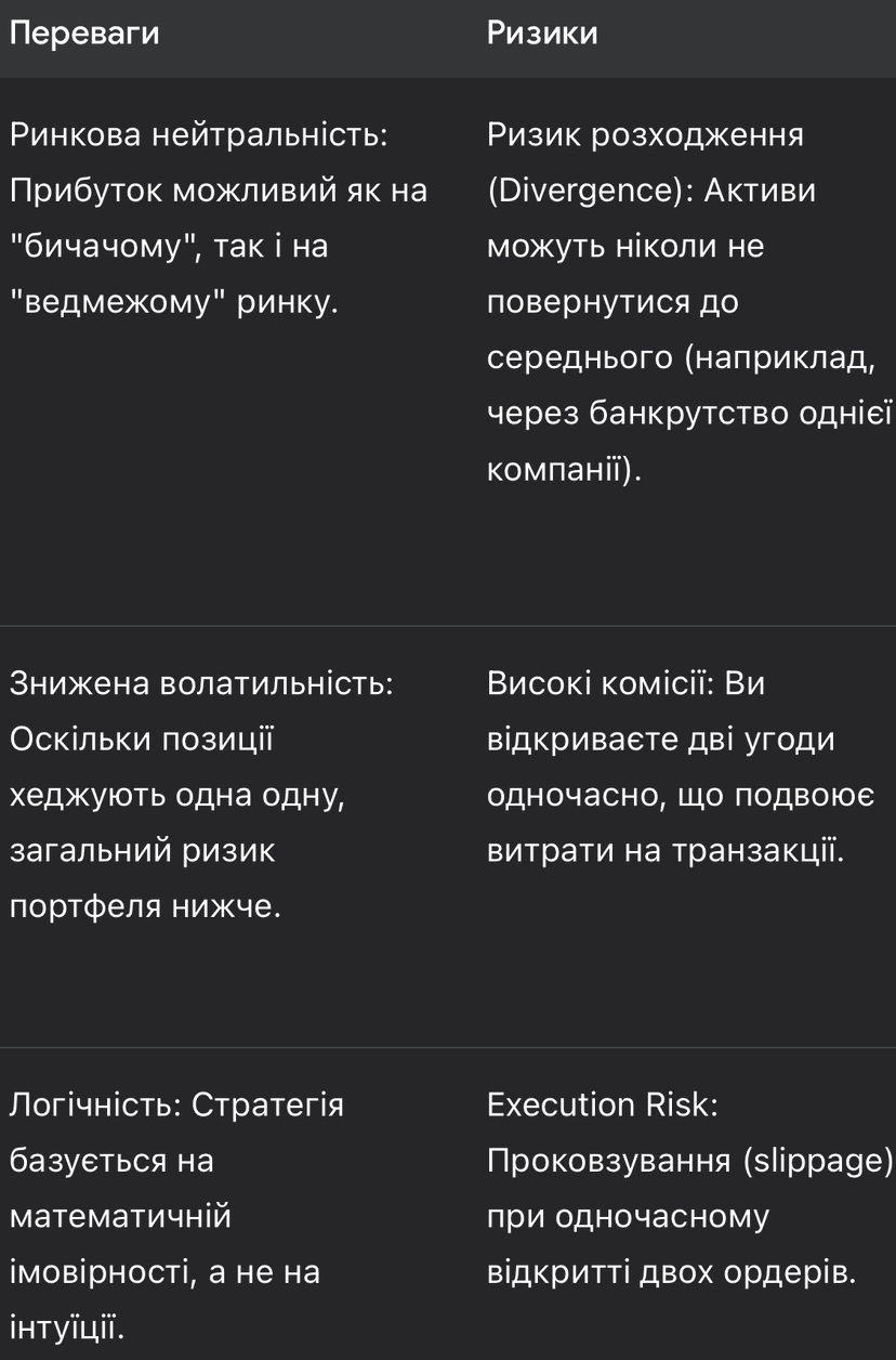 • Результат: Ви очікуєте, що або ETH "охолоне", або BTC "наздожене" його. Якщо ринок загалом впаде, ваш Short по ETH принесе більше, ніж втратить Long по BTC. Ви заробите на звуженні розриву.