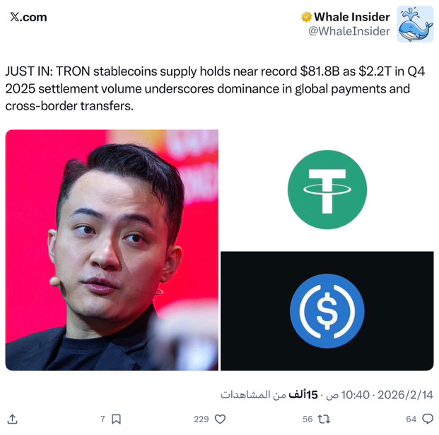 بحلول مطلع 2026، بلغ معروض العملات المستقرة على شبكة ترون، ومعظمه من USDT، نحو 81.8 مليار دولار. وهذا يمثل أكثر من نصف إجمالي USDT المتداول عالمياً. الأمر لا يقتصر على الضجيج، بل يشكل العمود الفقري لمدفوعات العملات الرقمية اليومية مثل التحويلات العابرة للحدود، والرواتب، والتحويلات الصغيرة بين الأفراد.