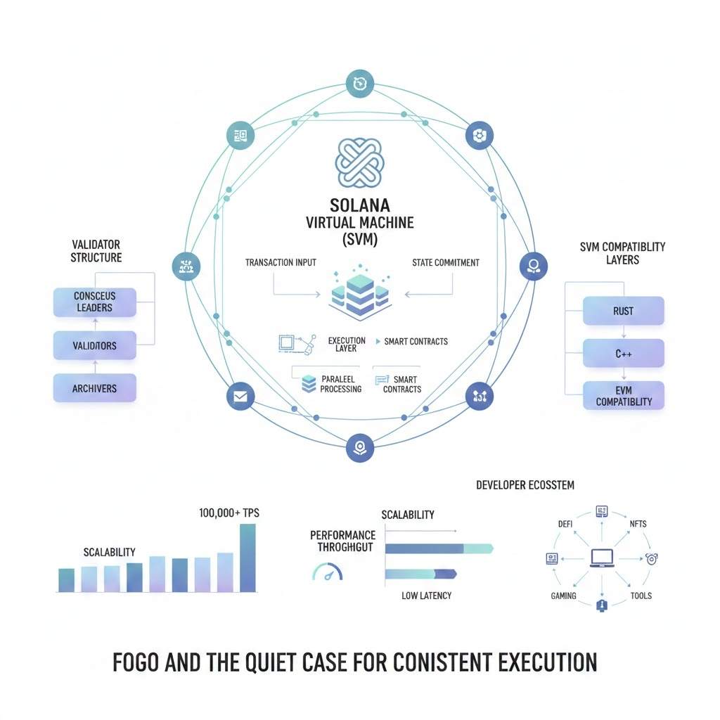 At its core, Fogo is a Layer 1 built around the Solana Virtual Machine. The choice is practical. SVM already has a developer base, tooling, and a known execution model. By building around it, Fogo avoids reinventing the programming environment and instead concentrates on how transactions are processed and finalized. If you think of execution layers like highways, SVM is the vehicle standard, while Fogo tries to widen and manage the road so traffic flows more predictably during peak hours.