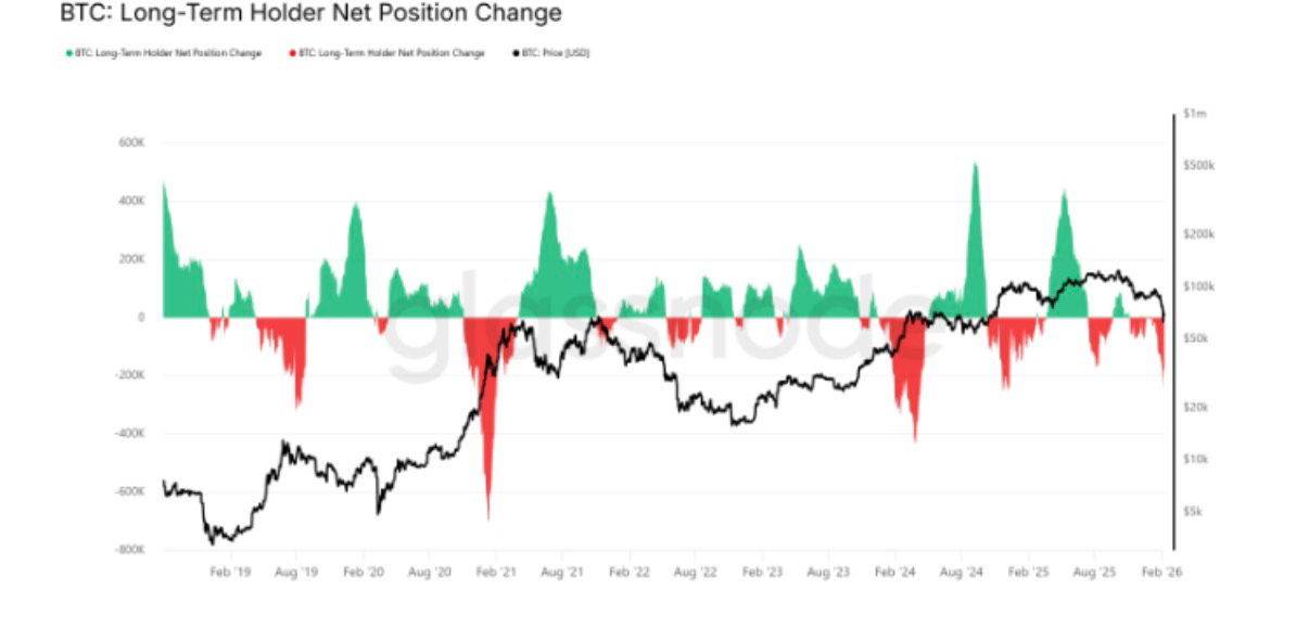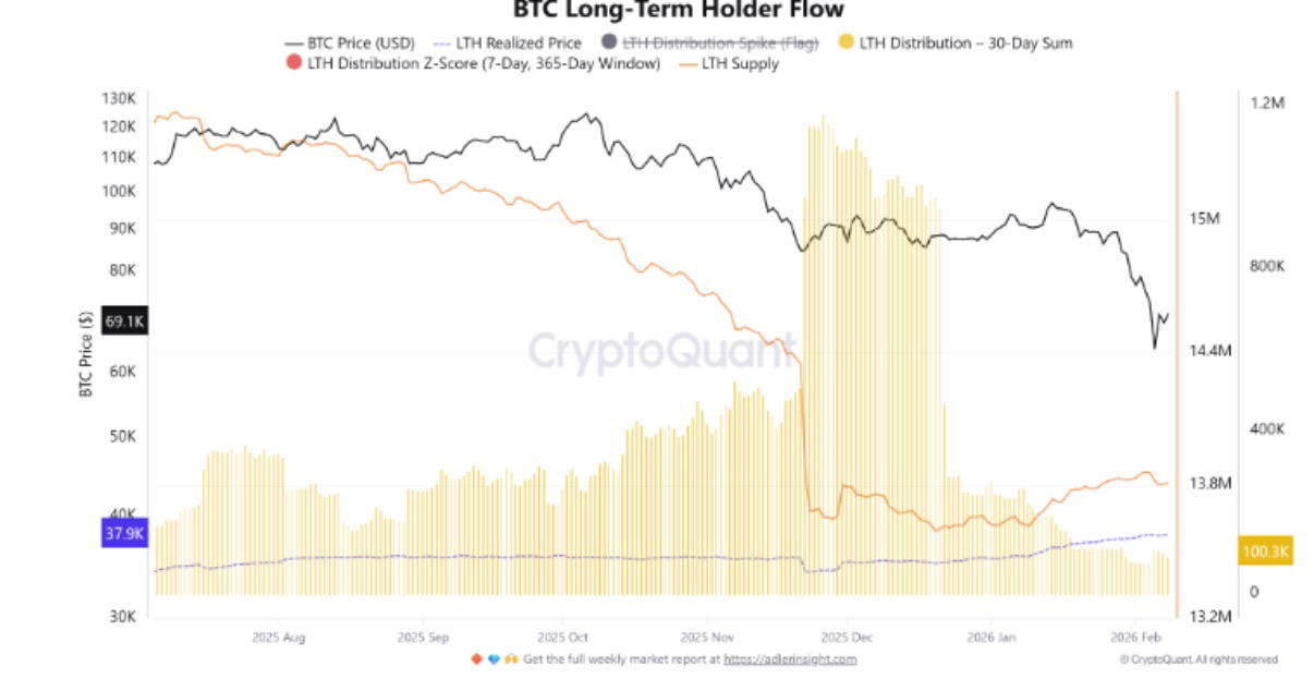链上数据显示,长期持有者(LTHs)以自2024年12月以来最快的速度减少了敞口,但长期投资者持有的总供应量在2026年持续上升,这一背离可能表明交易者正在重新定位,比特币可能被贴现。
