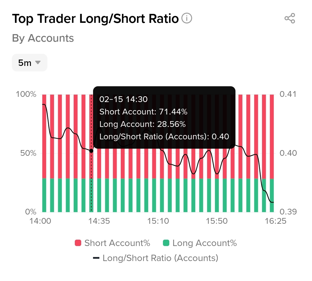 And here's where the narrative falls apart for the bulls. The Long/Short ratio by accounts sits at a dismal 0.40, meaning traders are overwhelmingly positioned for continued downside. At the 14:30 timestamp captured in the data, shorts outnumbered longs nearly 3-to-1.