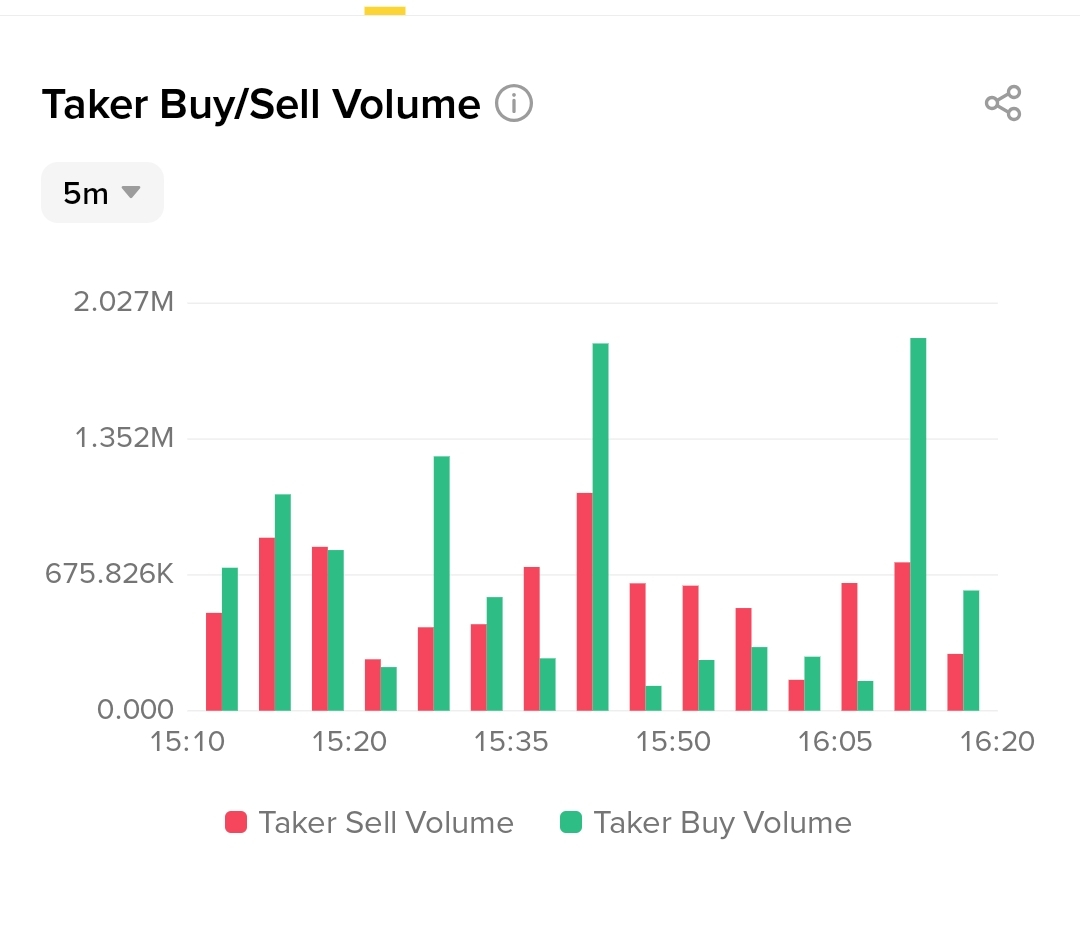 Green bars (taker buy volume market orders lifting offers) have consistently exceeded red bars (taker sell volume - market orders hitting bids) in several key periods. The largest taker buy volumes occurred around 15:40 and again at 16:15, reaching approximately 1.9-2M.