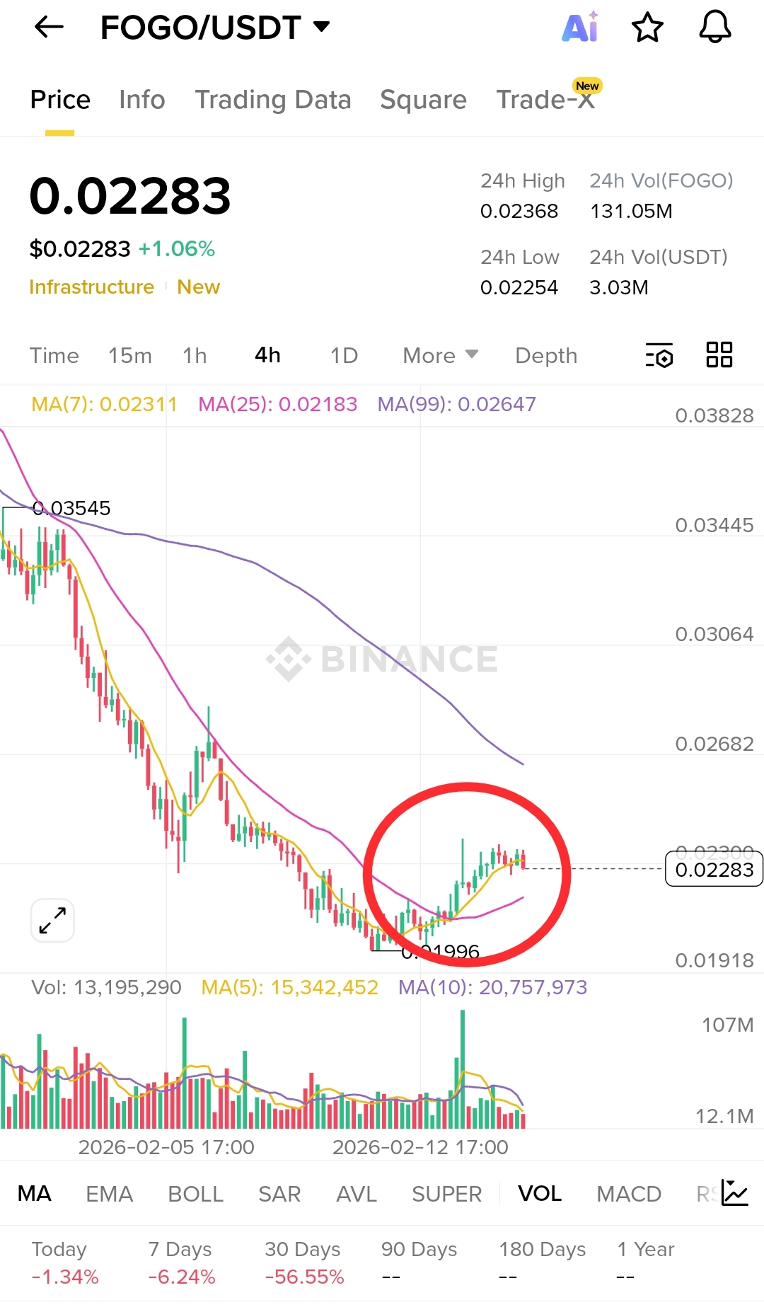 On the surface, FOGO's chart looks like it could be lifted straight from a technical analysis textbook. The token cratered from $0.03545 down to $0.01996 - a gut-wrenching 44% plunge that likely liquidated countless over-leveraged longs. But around that $0.02000 level, something interesting happened.