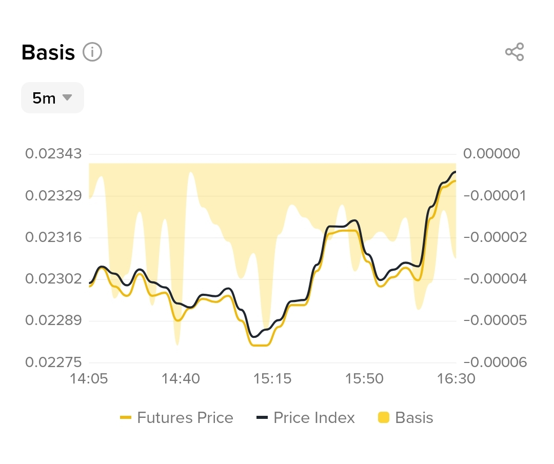 The Basis chart shows the futures price trading at a slight premium to the spot index, with the spread oscillating between negative and neutral territory throughout the session. Currently, we're seeing futures at $0.02334 with the basis compressed near zero.