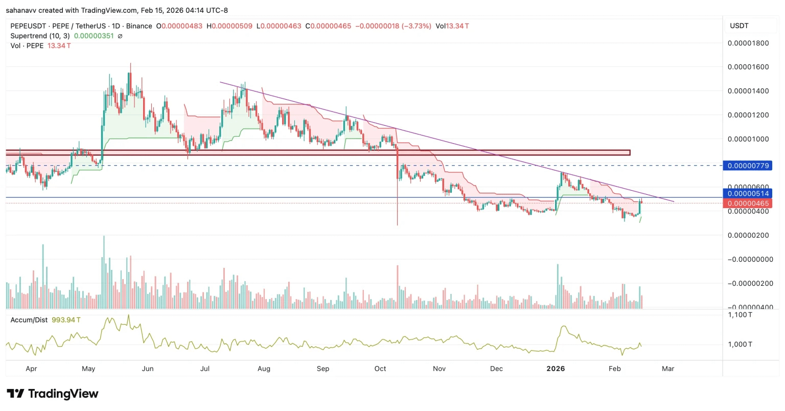 Mira, la realidad con PEPE es que estamos viendo una película que ya conocemos: intenta subir, emociona a todo el mundo, pero se estampa contra una línea de tendencia descendente que lleva meses siendo su peor enemiga. Aunque hace poco vimos un repunte que nos puso a vibrar y hasta el indicador Supertrend se puso en verde (dándonos esa chispa de esperanza a corto plazo), la verdad es que al movimiento le falta "gasolina" para mantenerse arriba. ⛽📉