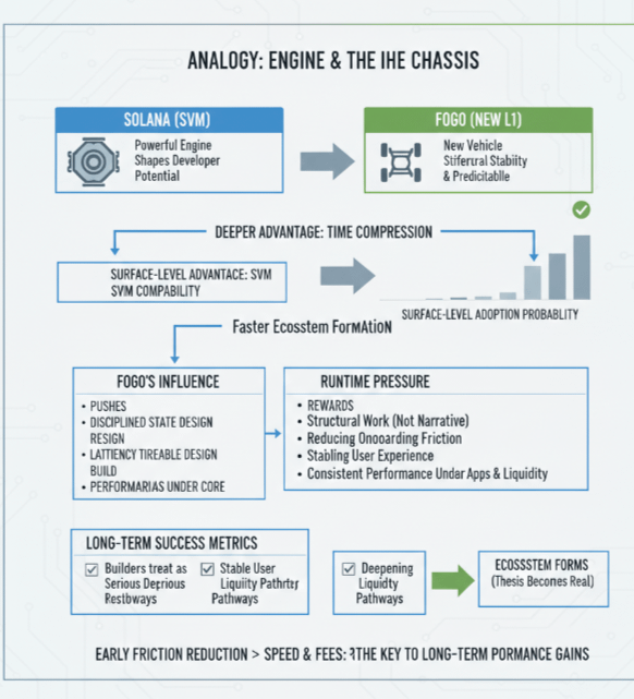 A simple analogy makes this clearer. Solana created a powerful engine. Fogo is building a new vehicle around that engine with different structural choices. The engine shapes developer ergonomics and raw performance potential. The chassis determines stability, predictability, and whether the system holds together when everyone shows up at once.