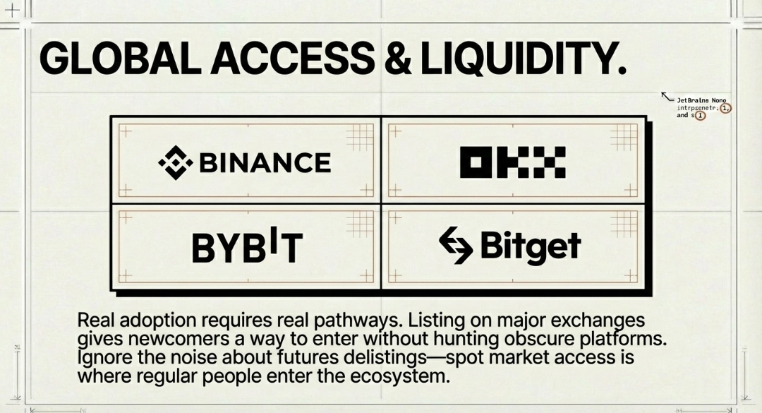 Of course, liquidity depth and trading volume will evolve over time. Some of the headlines have talked about futures for the token being delisted on one exchange. That’s short-term noise. What matters is ongoing spot market access, because that’s where regular people actually come in and out of the token not leveraged contract positions.