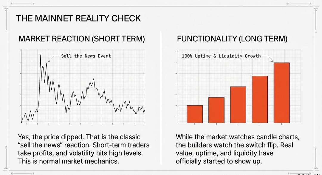 When mainnets go live, there’s that classic “sell the news” reaction from markets, and Fogo saw a price dip early on. But this is normal. When something finally switches from test to real, a lot of short-term traders take profits. What matters more than the token chart that day is the functionality that’s now live.