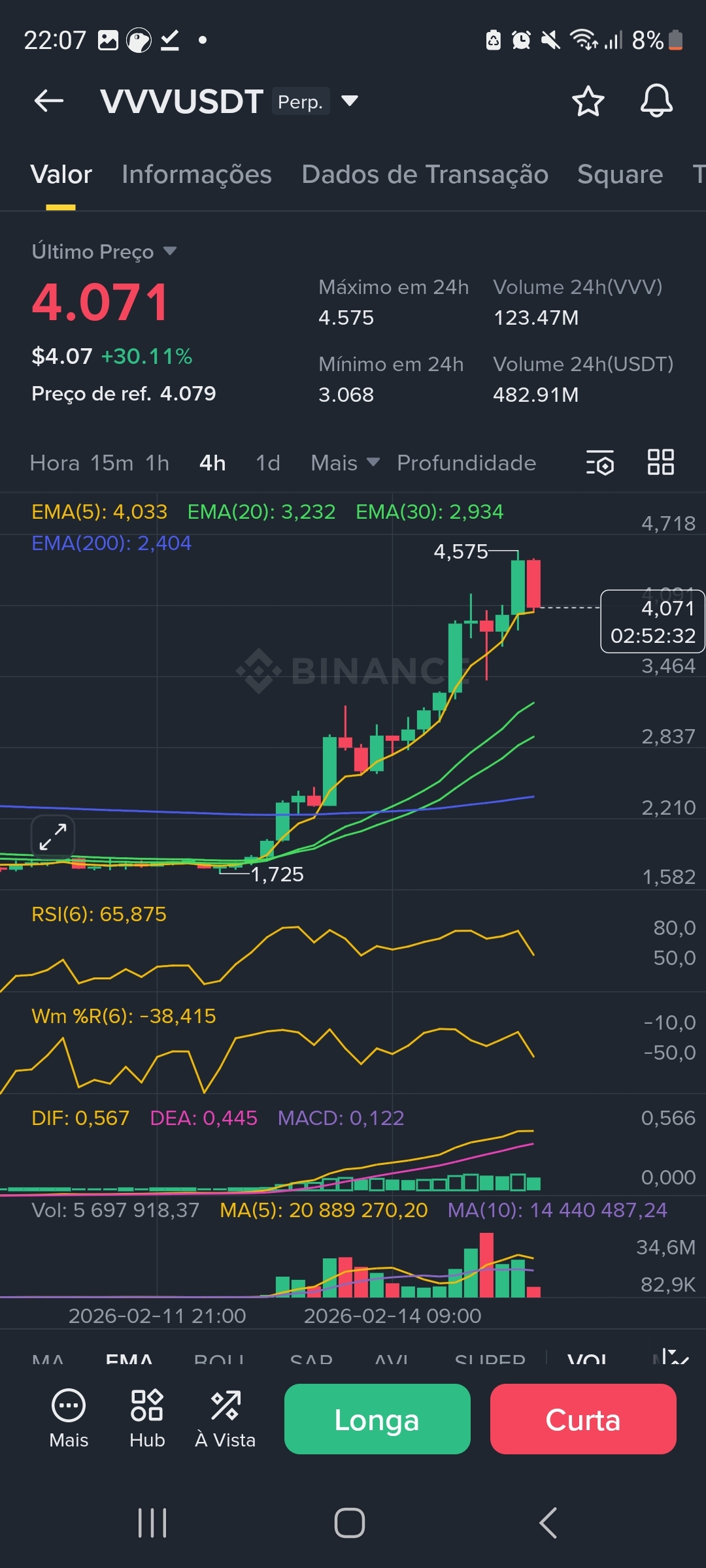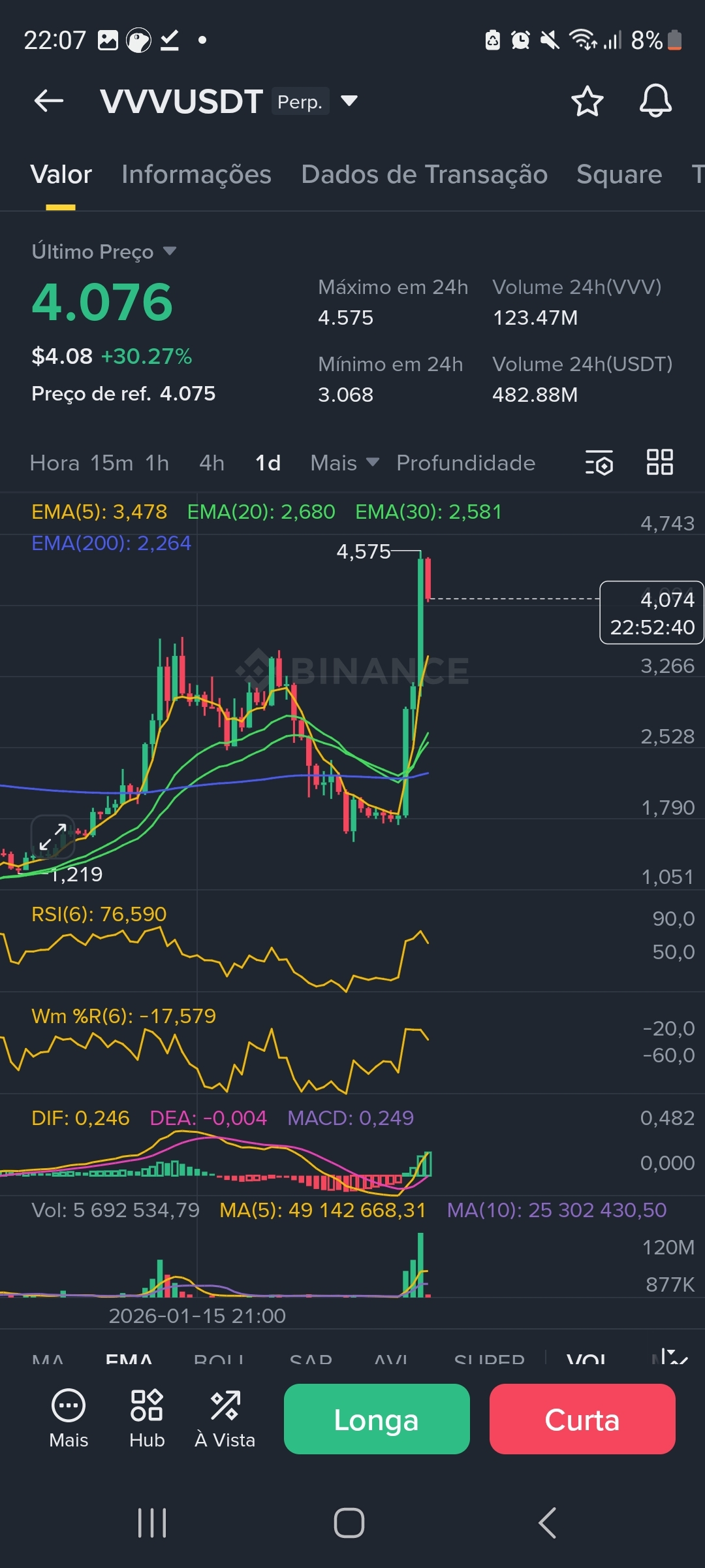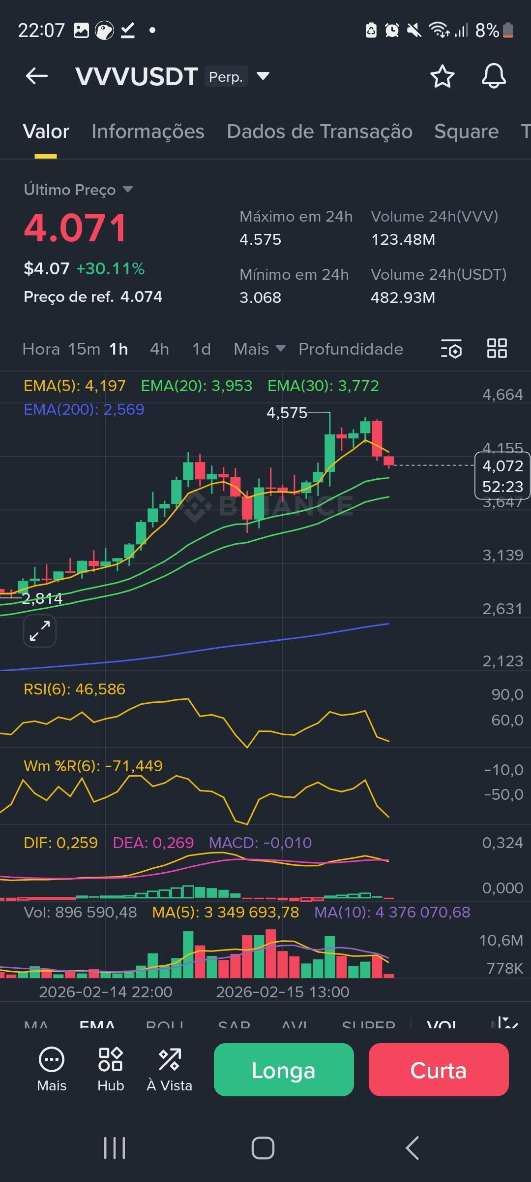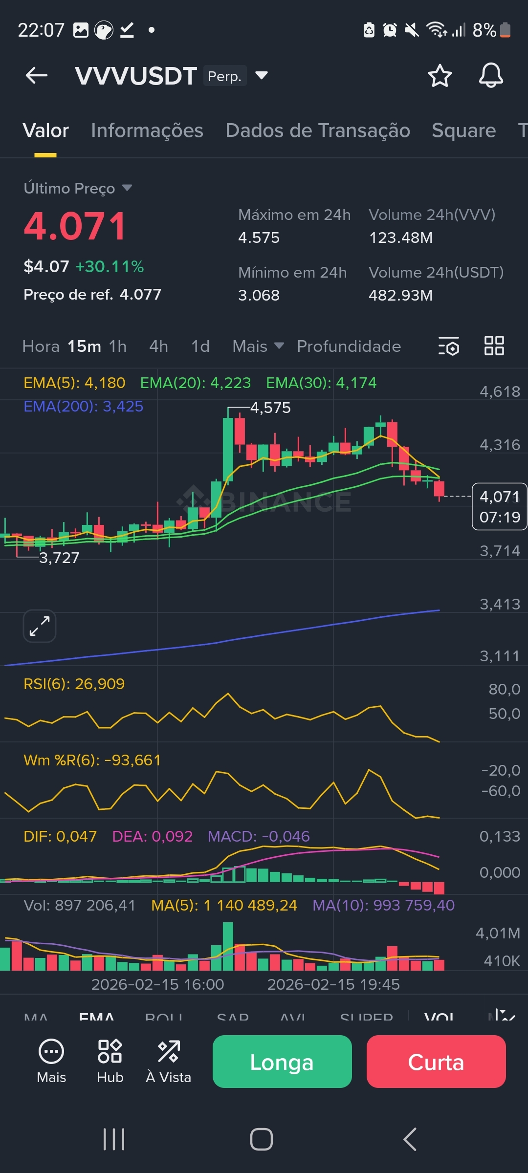 * Visão Micro (1H/15M): No gráfico de 15M, observamos o preço trabalhando abaixo da EMA(5), EMA(20) e EMA(30), sinalizando uma reversão de curto prazo. O RSI(6) em 15M está em 26.90, indicando sobrevenda imediata, mas o MACD e a Wm %R mostram forte momentum descendente.