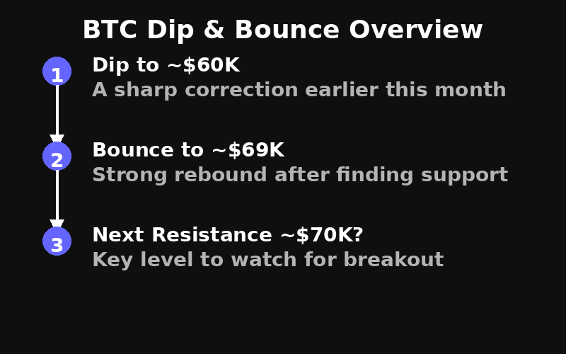 Infografic: 3–4 puncte simple (Scădere la $60K → Bounce la $69K → Următoarea rezistență $70K?).