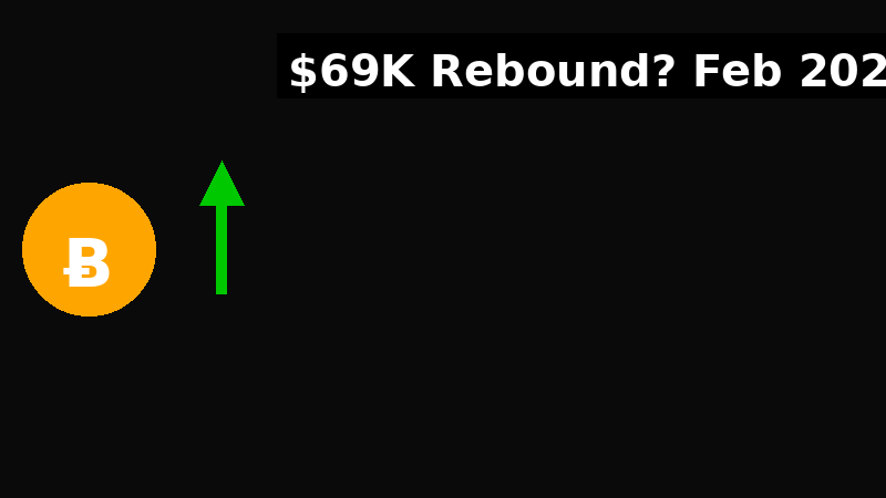 Miniatură: Text îndrăzneț “$69K Rebound? Actualizare februarie 2026” + săgeată verde + logo BTC (fundal întunecat).