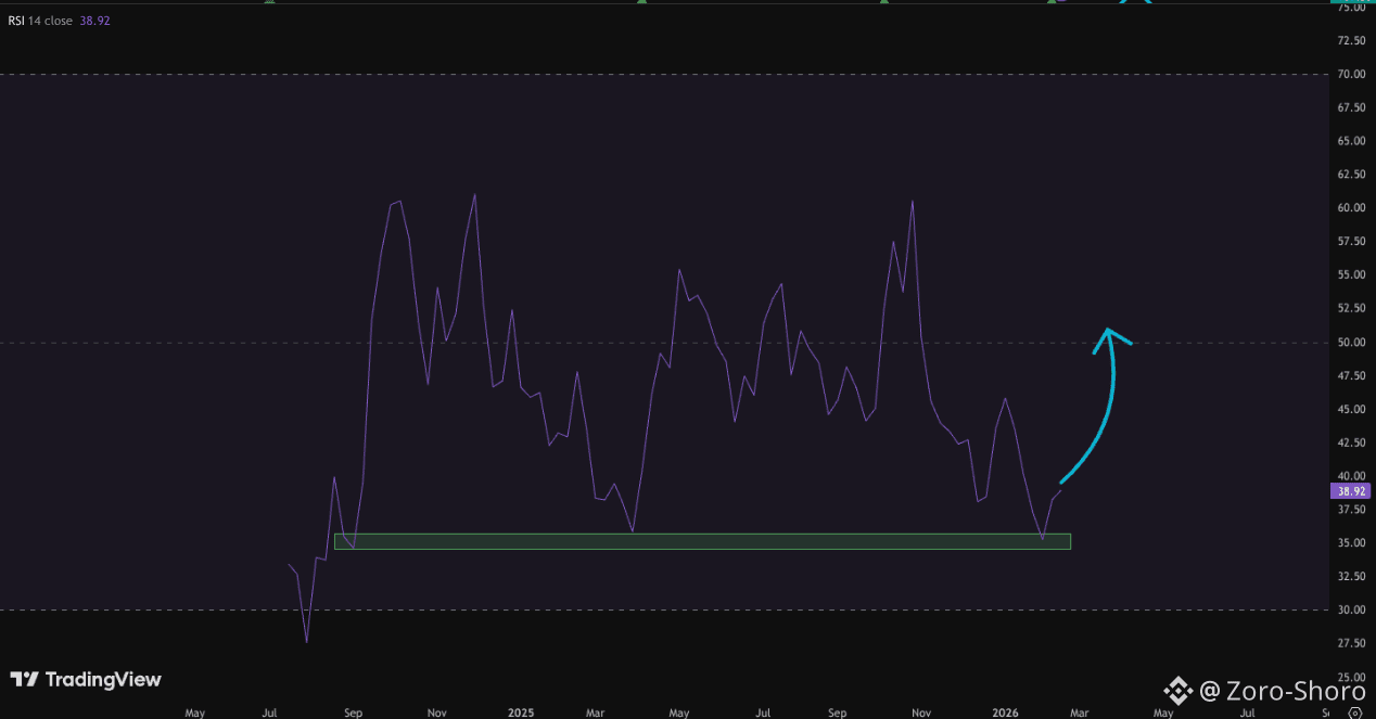 The RSI shows a clear support zone, highlighted with a green rectangle in the chart. Historically, RSI bounced from this zone three times, each time resulting in upward momentum on the weekly timeframe.