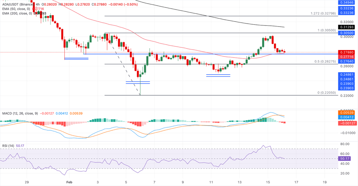 إذا انزلقت $ADA دون 0.2772 دولار، فقد تختبر مستوى تصحيح 50% عند 0.2669 دولار، المقاس من أعلى مستوى في 3 فبراير عند 0.3050 دولار إلى أدنى مستوى في 6 فبراير عند 0.2289 دولار.