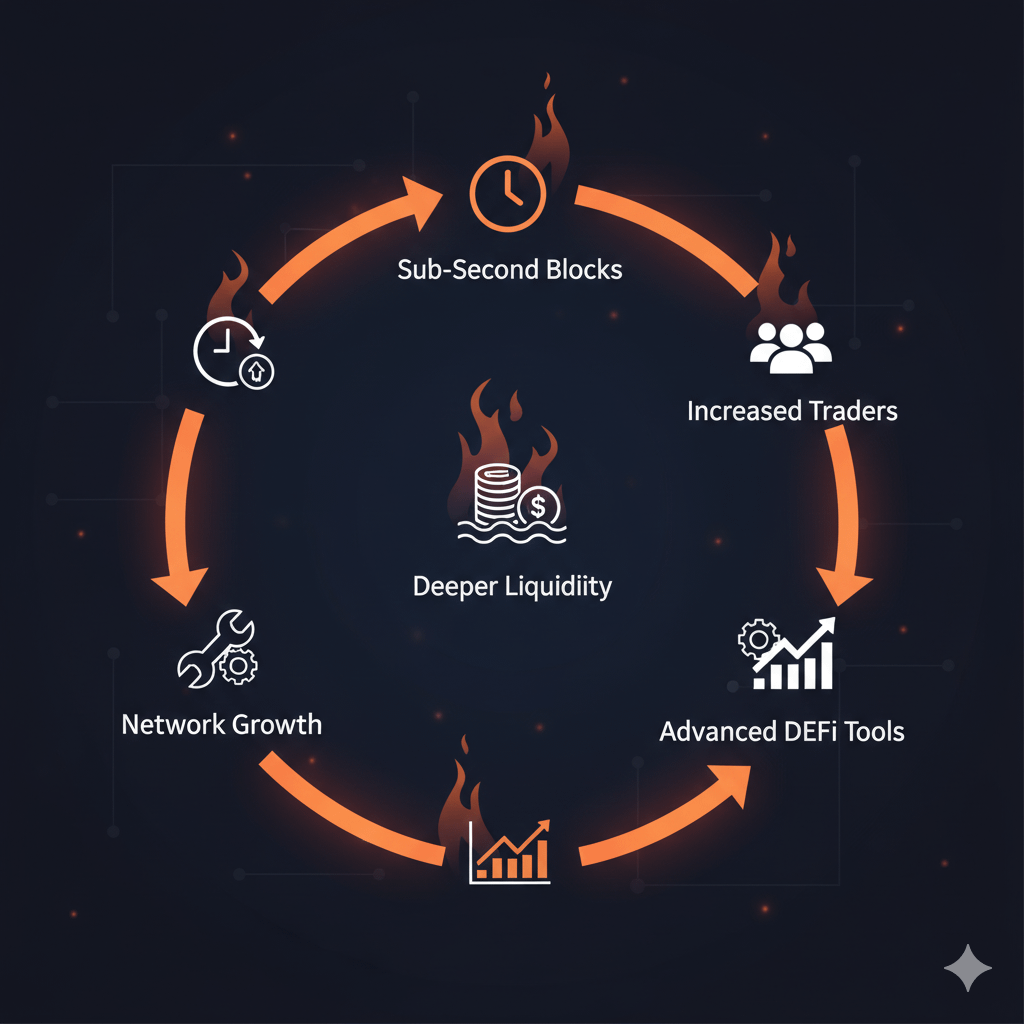 Still, advantages here don't accrue linearly; they snowball. Start with those sub-second blocks: traders flock in, executing complex orders without lag. That influx boosts liquidity, tightening spreads and drawing more sophisticated players—market makers, perhaps, who then integrate native tools like the DEX. Deeper pools enable novel instruments, say perpetuals with embedded leverage, pulling in devs to build atop them. And as the network stabilizes under load, costs per user drop further, creating a retention loop that general chains envy. Over quarters, this could shift entire subsectors: high-frequency trading migrates onchain, eroding CeFi's monopoly.