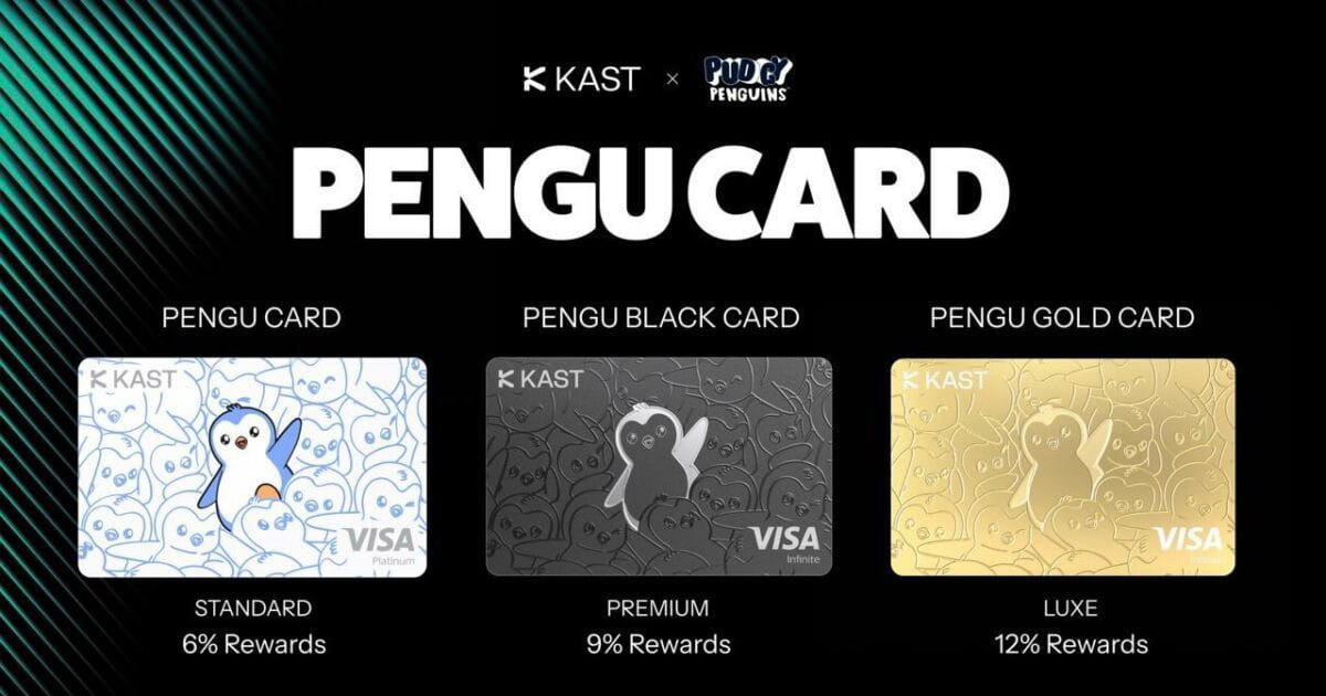 • 最新重磅:2026 年 2 月 11-13 日宣布与 KAST 和 Visa 合作推出 Pengu Card(Pengu Visa 联名借记卡)。这是品牌正式进入消费金融领域,支持 USDC/USDT 等稳定币直接在全球 150M+ Visa 商户消费(170+ 国家),虚拟卡先发、实体卡后续。三档(Standard/Black/Gold),最高 12% 消费奖励 + 账户最高 7% yield。等待名单已开放(https://www.kast.xyz/pudgy-penguins),邀请好友可获免费高端卡。