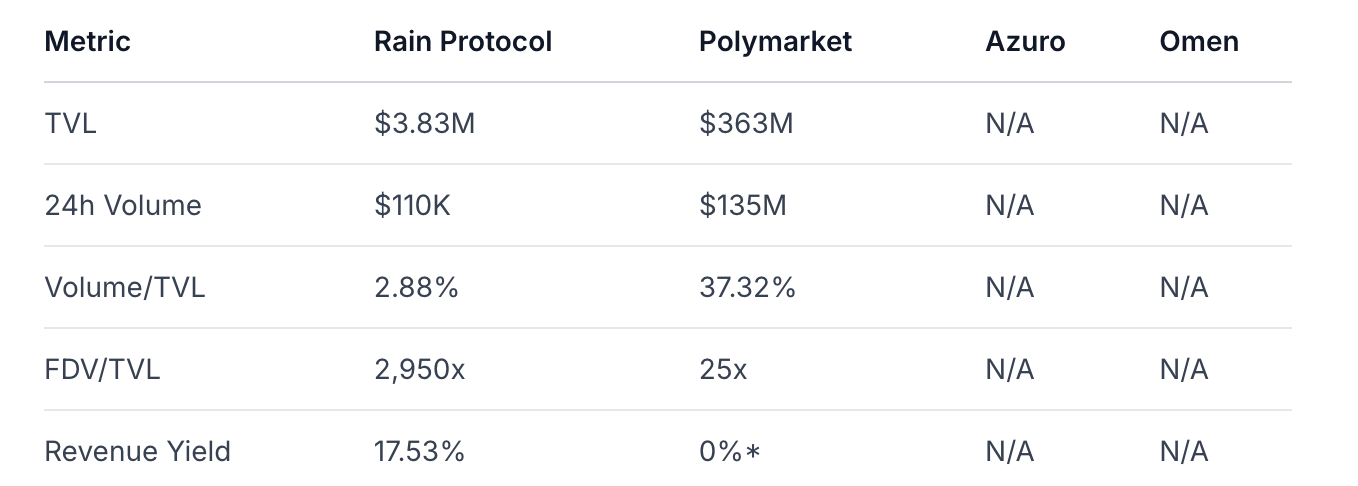 Competitive Positioning: The "Uniswap of prediction markets" thesis is compelling but unproven. Rain's technical differentiation (AI oracle, Rain VM) provides potential moat, but liquidity network effects will be crucial for long-term success.