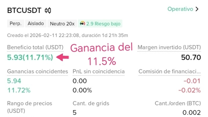 "Așa cum puteți vedea în captura mea, cu un margine de doar $50.70 am reușit deja un 11.71% profit menținând un risc scăzut de 2.9. Cheia nu este câți bani ai, ci cum configurezi botul."