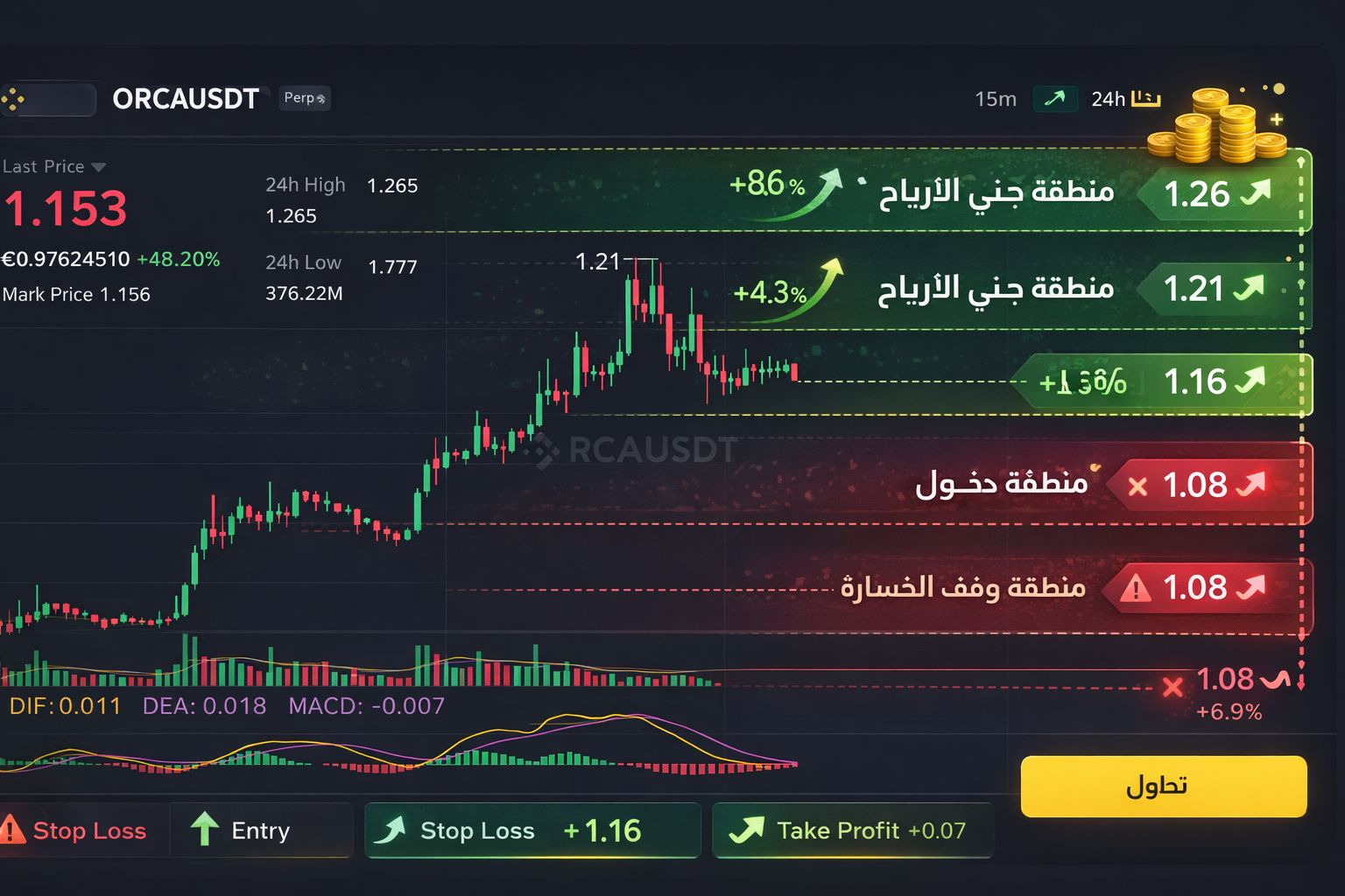 $ORCA The ORCAUSDT pair recently experienced a strong bullish wave that pushed the price near the 1.26 high, before entering a clear consolidation phase above the 1.15 level. This price behavior reflects a real battle between buyers and sellers, but current technical signals suggest that bullish momentum remains intact as long as price holds above the identified support zones.