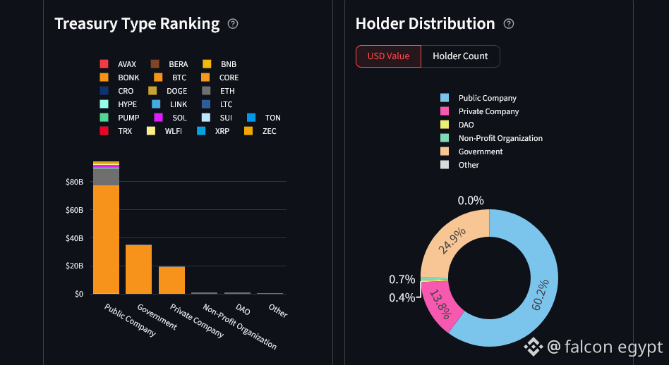 الشركات العامة (Public Company): هي الفئة المهيمنة، حيث تمتلك أصولاً تتجاوز 80 مليار دولار.الحكومات (Government): تأتي في المرتبة الثانية بأصول تقترب من 40 مليار دولار.الشركات الخاصة (Private Company): تمتلك حوالي 20 مليار دولار.فئات أخرى: تشمل المنظمات غير الربحية، والمنظمات اللامركزية (DAOs)، وغيرها، ولكن بمبالغ أقل بكثير.مفاتيح العملات: الألوان في أعلى الرسم توضح توزيع العملات (مثل BTC، ETH، SOL، وغيرها) داخل هذه الخزائن.