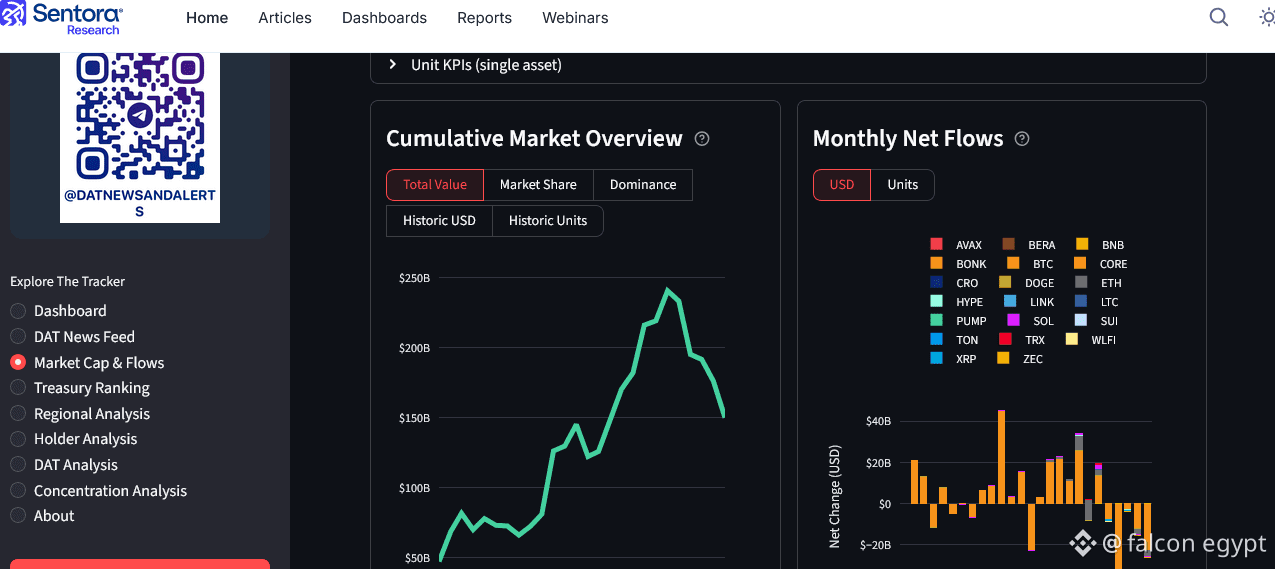 الصورة واجهة من "متتبع خزينة الكريبتو" (Crypto Treasury Tracker) الخاص بمنصة Sentora Research. توفر هذه اللوحة تحليلات حول كيفية احتفاظ المؤسسات الكبرى بالعملات الرقمية كأصول احتياطية.