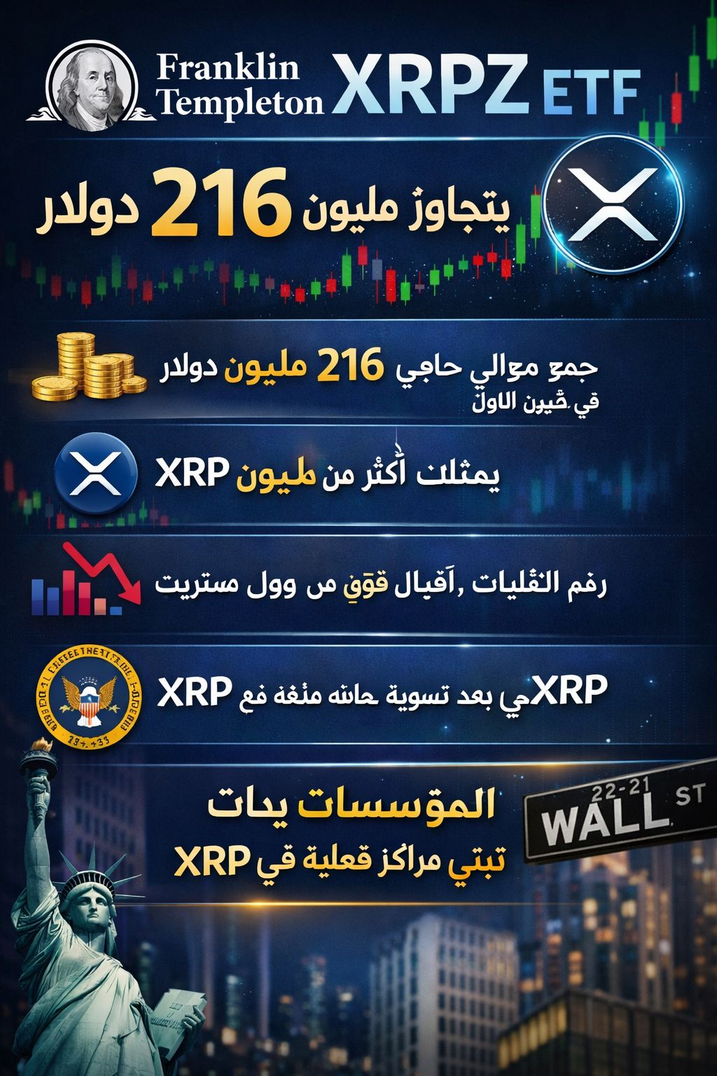 في خطوة تُظهر تحولًا كبيرًا نحو التبني المؤسسي، حقق صندوق Franklin Templeton XRP ETF (الرمز: XRPZ) نجاحًا سريعًا منذ إطلاقه في 24 نوفمبر 2025 على بورصة NYSE Arca.خلال الربع الأول من التشغيل (حتى نهاية ديسمبر 2025)، جمع الصندوق أصولًا تصل إلى 216 مليون دولار تقريبًا، مدعومة بحوالي 118.3 مليون XRP. هذا يعني أكثر من 10.9 مليون سهم صادر، مما يعكس إقبالًا قويًا من المستثمرين المؤسسيين في فترة قصيرة جدًا.رغم خسارة غير محققة مؤقتة بلغت 28.6 مليون دولار بسبب تقلبات سعر XRP، الرسالة واضحة: هذا ليس زخمًا تجزئيًا (retail) بعد الآن. رأس المال المنظم من وول ستريت يبني تدريجيًا تعرضًا كبيرًا لـ XRP من خلال قنوات منظمة وآمنة.لماذا هذا مهم؟ يؤكد الإطلاق الناجح لـ XRPZ (بعد حل النزاعات القانونية مع SEC) أن XRP أصبح خيارًا شرعيًا للمؤسسات.