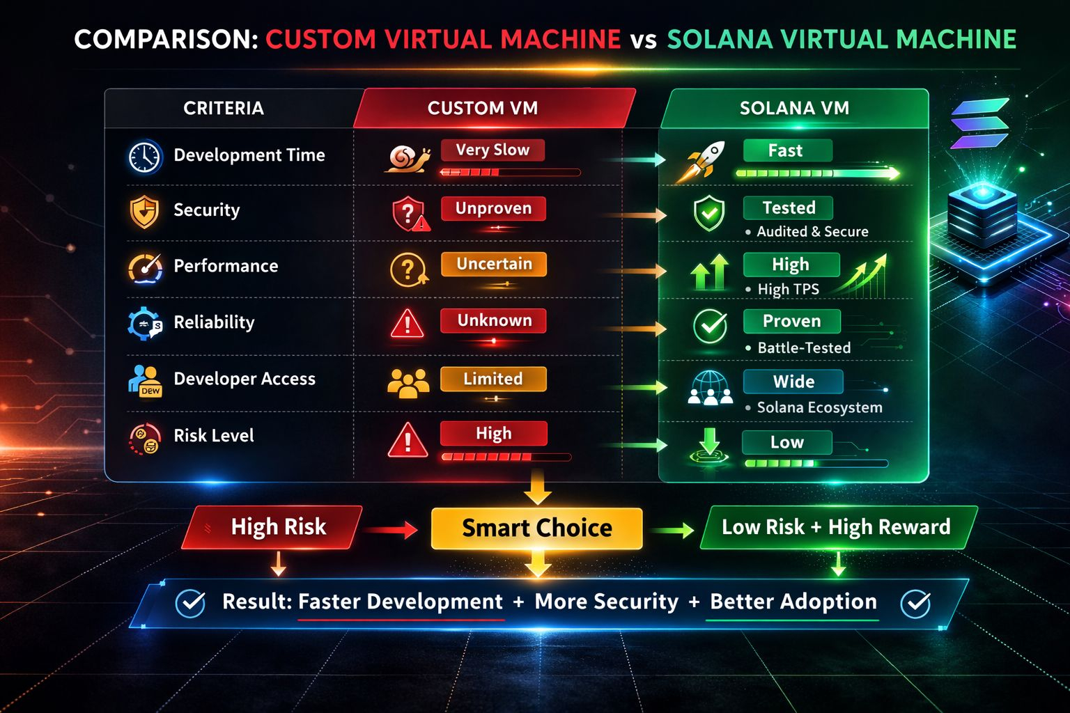 Building a custom virtual machine is a complex and risky process. It requires years of research, testing, debugging, and security audits. Even then, there is no guarantee that the system will perform efficiently or securely. Many blockchain projects have faced delays and failures because of issues in their custom execution environments.